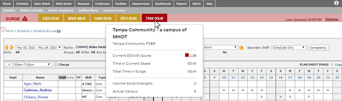 This feature utilizes an API integration between TrackER and Facility Scheduler (FS) to provide staffing analysts a snapshot of Emergency Department (ED) surge information so they can make timely staffing adjustments. When an Emergency Department (ED) experiences surge conditions, color-coded alerts display on the Schedule and Staffing Dashboard screens. The alert displays an abbreviated facility name and the surge duration. Alert data refreshes every 20 minutes.