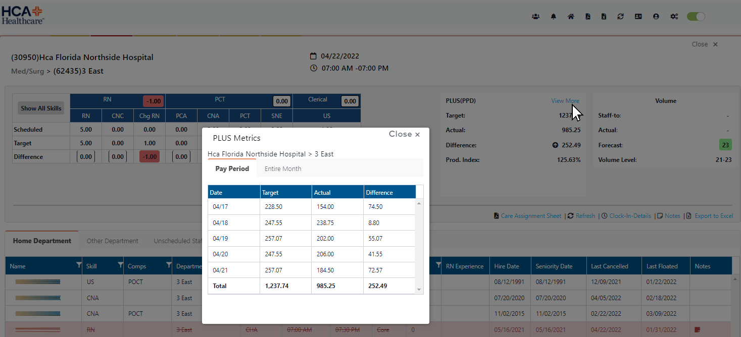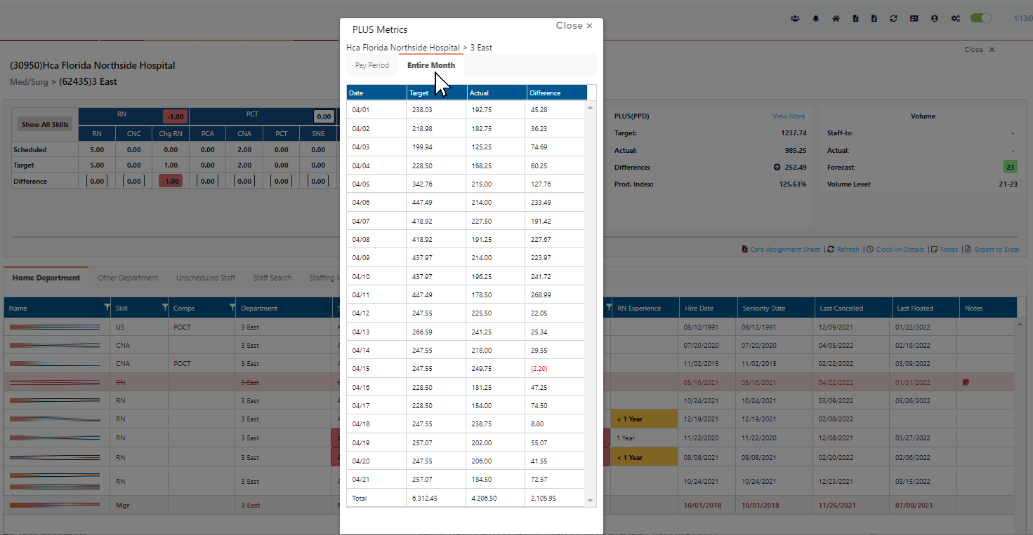 Staffing Dashboard Displaying Totals for Month-to-Date Productive Hours